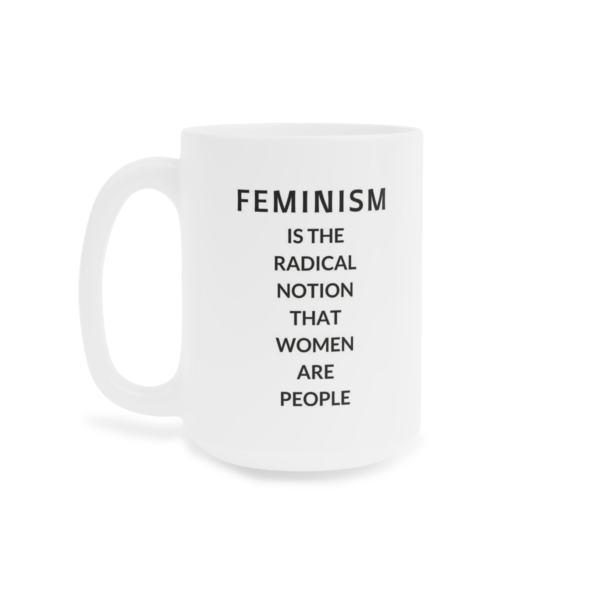 This 15 oz and 20 oz ceramic mug features the quote, 'Feminism is the radical notion that women are people.' It offers a bold and empowering statement for those passionate about gender equality and social justice. This mug is perfect for feminists, activists, and anyone who wants to make a statement with their morning coffee or tea. It is relevant for International Women's Day, Women's History Month, and everyday empowerment.