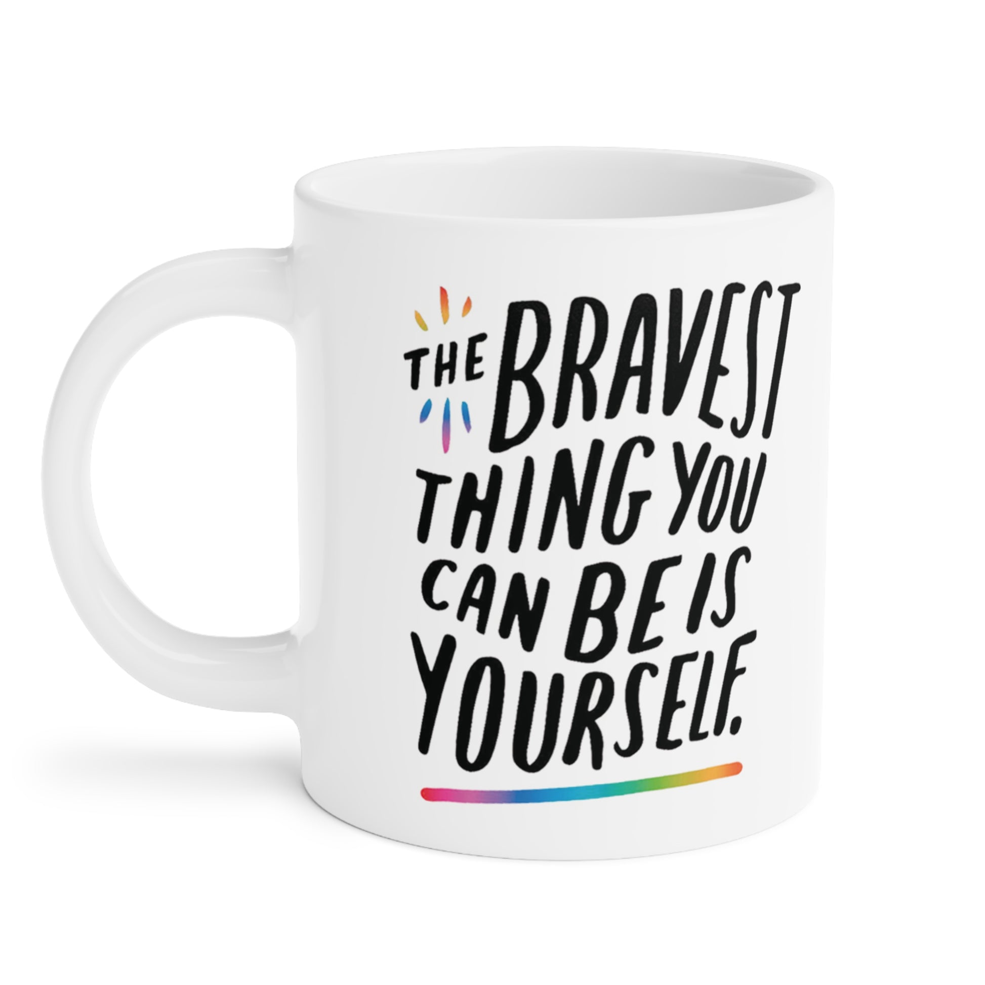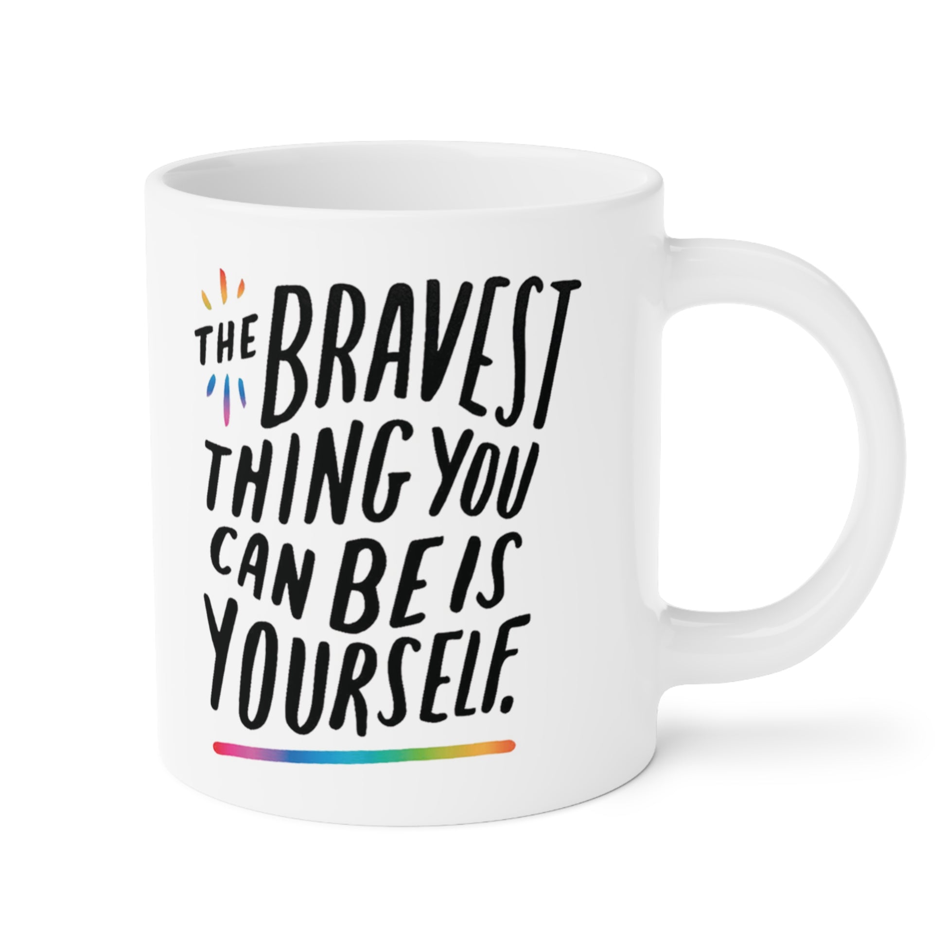 This 15 oz and 20 oz ceramic mug features the quote, 'The Bravest Thing You Can Be Is Yourself.' It offers a bold and empowering statement for those passionate about gender equality and social justice. This mug is perfect for feminists, activists, and anyone who wants to make a statement with their morning coffee or tea. It is relevant for International Women's Day, Women's History Month, and everyday empowerment.