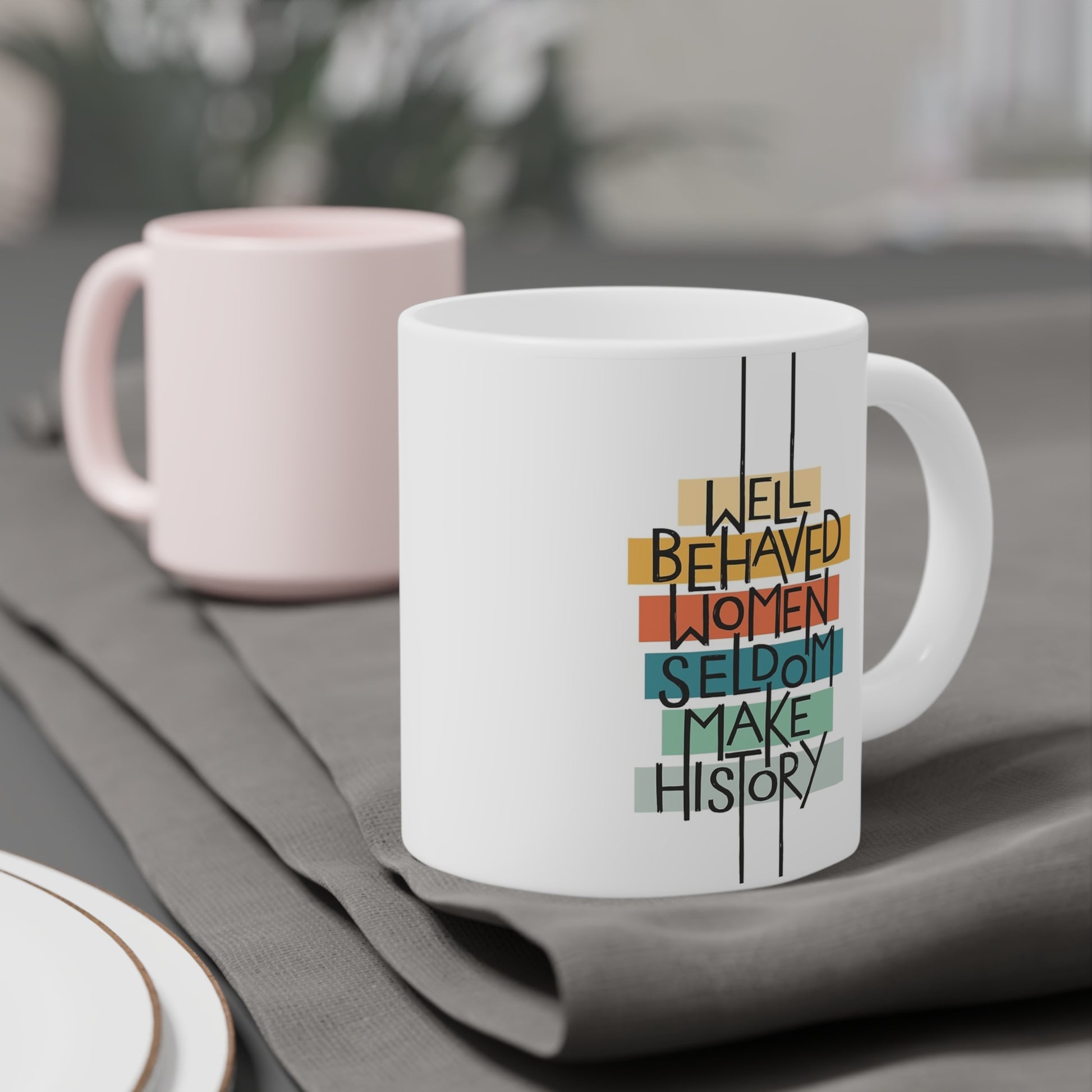 This 15 oz and 20 oz ceramic mug features the quote, 'Well Behaved Women Seldom Make History' It offers a bold and empowering statement for those passionate about gender equality and social justice. This mug is perfect for feminists, activists, and anyone who wants to make a statement with their morning coffee or tea. It is relevant for International Women's Day, Women's History Month, and everyday empowerment.