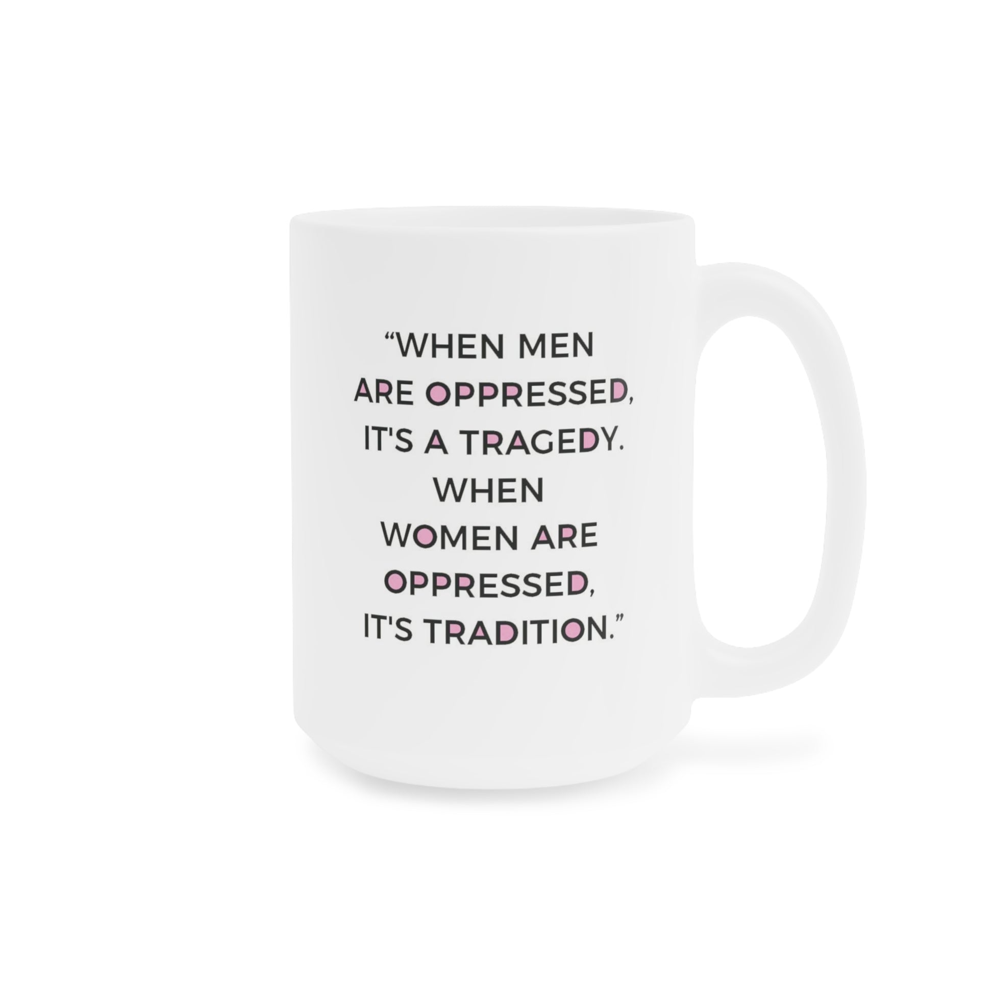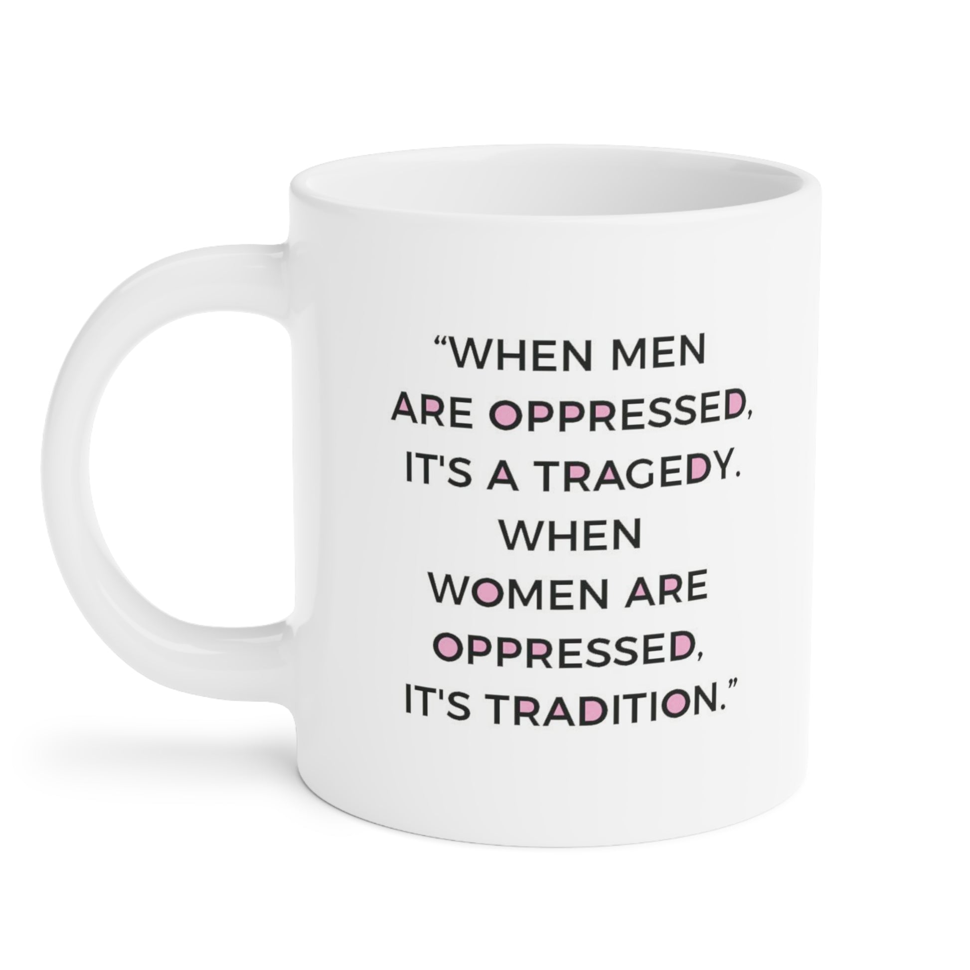 This 15 oz and 20 oz ceramic mug features the quote, 'When men are oppressed it's a tragedy. When Women are oppressed it's tradition.' It offers a bold and empowering statement for those passionate about gender equality and social justice. This mug is perfect for feminists, activists, and anyone who wants to make a statement with their morning coffee or tea. It is relevant for International Women's Day, Women's History Month, and everyday empowerment.